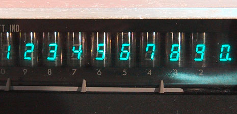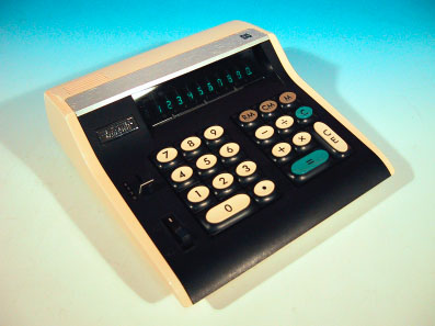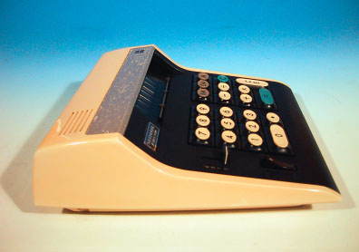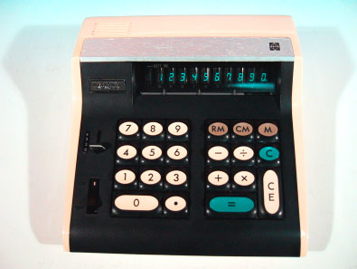 ■Panac Model JE−1010 Panac JE−1010は、既出のJE−800の上位バージョンに相 当する。JE−800ではメモリ機能は搭載されず、表示桁数も8桁止まりで あったが、JE−1010ではメモリ機能を内蔵し、表示桁を10桁に拡張し た。デザイン的にはJE−800と全く同じといって良いが、桁数が増えた分 だけ横幅が拡張している。キーボードは、JE−800の「×」と「+」のキ ーが縮小され、空いたスペースにメモリ関連キー「RM」「CM」「M」の3 つが追加されている。小数点制御は0、2、3、4の4段階に設定可能。 本製品には製造年月を示す表示は無いが、外観デザインと部品構成から考え ると、JE−800とほぼ同じ1972年以降の製品と思われる。