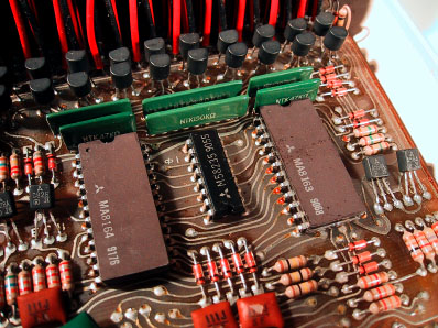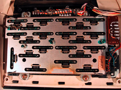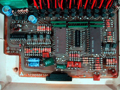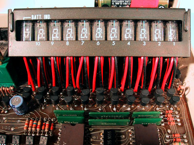 8桁版であるJE−800では、メインとなる電卓専用LSIとしてTI社 製のワンチップ電卓LSI「TMS−0101NC」を使用していたが、10 桁版のJE−1010では三菱製のLSIを2個使用している。LSIの型番 はMA8163とMA8164で、共に24PinセラミックDIPパッケー ジ製品だ。この他に、同じく三菱製ICであるM58235とM58203が 1個ずつ使用されている。古い電卓としては、部品構成もすっきりとしており 比較的集積化が進んでいる製品と言えよう。 蛍光表示管のドライブ用として、2SA749を22個使用している。蛍光 表示管は符号桁も含めて全部で11本あるため、各桁ごとに2個使っているこ とになる。この他にも制御回路にはトランジスタが15本近く使われている。 基板はベークライト製。製造年月を示す表示はどこにも見当たらない。蛍光 表示管はチューブの長さが25mm程度の小型ものもで、メタルのフレームに マウントされている。蛍光表示管のリード線は基板に直接ハンダ付けされてお り、組み立てにはかなりの手間がかかっている。表示はチューブの中に7セグ メントを内蔵したタイプで、一番左側の管は符号桁となっている。符合桁には メモリ(M)、マイナス(−)、バッテリーインジケータ(・)の3種類が表 示される。蛍光表示管表示部の後ろ側には、電源回路が搭載される。TDK製 DC−DCコンバータと思われるYLPT CT−1010と記載されたブロ ック状の部品が搭載されていた。 ロジック基板とキーボード基板とはコネクタで接続されている。キーボード は磁石によるリレー接点タイプで、非常に堅牢な設計となっている。本体内部 には、NO2X01024のシールが添付されていた。