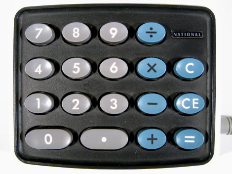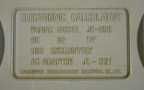 1972年製造のナショナル製8桁電卓、Panac JE-850。松下通信工業株式会社電卓事業部製造の製品である。 この電卓の特徴は、何といってもスペースエイジ感覚満点のデザインにある。たかが電卓と侮れないくらい、この造形はすごい。筆者は、数ある電卓の中でも、このJE-850は傑作中の傑作だと信じて疑わないくらい、惚れ込んでいる。表示部分とキーボード部分を上下に配置し、中央部分にくびれを持たせた形状は、セクシーですらある。ナショナルも以前は随分とオシャレな電卓を発売していたものだと感心することしきりだ。 キートップは全て楕円形のデザインで非常に深いストロークを持つ。キーは磁力リレー接点を使用している。表示は数字8桁+制御1桁の9桁表示で、桁別に分かれた7セグタイプの蛍光表示管を採用している。表示分のアクリルカバー越しに9本の表示管を見ると、思わずググっときてしまうほど魅力的だ。 電源はACアダプタ、乾電池、充電池の3電源方式を採用している。本体裏面下部には取り外し可能な電池室が搭載されており、標準で充電池ブロックと乾電池ブロックの2種類が付く。乾電池、充電池両ブロック共に、ACアダプタを接続するためのコネクタが設けられている。乾電池は単三型を4本使用する。乾電池の搭載方法は、Casio Miniのように極性の向きが同じになるように搭載する。 機能的には極めて単純で、四則演算のみの仕様となっており、メモリ機能は持たない。シリアル番号は電池室を外した本体裏面に貼付されており、本機はNO 2907531となっていた。本体裏側の銘版には、下記の表記がある。
