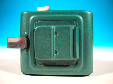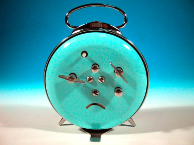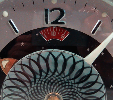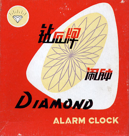 中国・上海製のダイアモンド牌アラームクロック。日本でも中国雑貨専門店が かなりの数仕入れていた商品である。同ブランドのデザインは多岐に渡り、これ 以外でも多くのバリエーションが製造されていた。さすがに最近は、このような ゼンマイ仕掛けの時計は少なくなってきている。 この時計、何と言っても配色とデザインが秀逸。純メカニカルであるという構 造も今となってはレトロで珍しいが、寝ぼけた水色の本体と、文字盤中央のなに やらワケの判らないデザインが怪しさと野暮ったさを演出している。中央に配置 された円板は2枚構成になっていて、秒針のように常時回転している。2枚のう ち回転するのは上の1枚のみで、下の板は固定されている。写真でも判るように 円板には妙な模様が書かれており、動作中はワサワサとこの模様が動くという、 実にイミプ〜な仕掛けとなっている。箱のデザインも昔っぽくてグッド!逆に今 でも十分通用すると思うのだが。