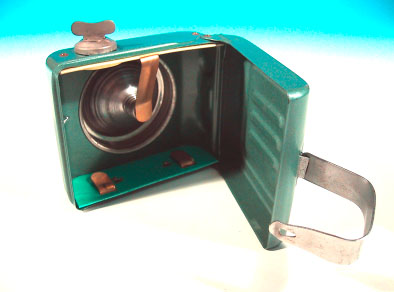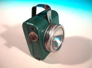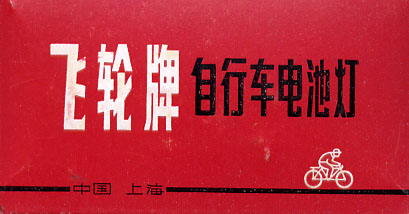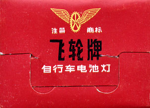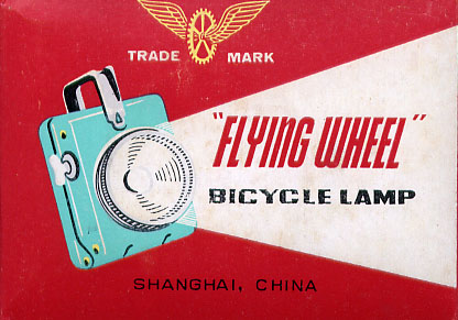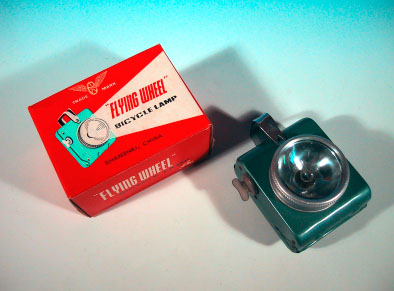 別項で取り上げた「マツダ乾電池ランプ」の、中国製造版。基本的な構造は同 じであるが、マツダ製品は戦後間も無い頃の製造であったのに対し、この製品は 少なくとも1990年頃までは現役で製造されていたところが異なる。最も、現 在でもしぶとく製造されている可能性もあるが。 メーカーは「飛輪牌」。外箱にもギアに翼が生えたデザインのロゴマークが印 刷されている。しかし、このロゴはカッコイイ!!!こういうセンスは大好きで ある。単一乾電池を2本使用する自転車用のランプで、全て金属製。プラスチッ ク類は内部配線の一部にしか使用されておらず、外側には見当たらない。オール 金属ボディはメカフェチにはたまらんであろう。本体背面にはメーカー名が刻印 で記される芸の細かさも見せる。ランプ前面のガラスは、取り外してみるといび つな円形となっており、豆電球はソケットに垂直に入らない。加工精度という文 字はこの製品には無く、実用できればそれでオツケイの世界なのだ。