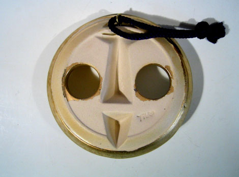 日本万国博覧会記念品。直径14cm程度の大きさの「太陽の顔」である。言わずと知れた岡本太郎画伯の作品。万国博覧会でテーマ館であった「太陽の塔」の壁面に描かれた顔である。財団法人日本万国博覧会協会の証紙付き。製造は近江化学陶器株式会社である。テーマ館である「太陽の塔」は、万国博覧会でも最も人気の高かったパビリオンで、筆者も2時間以上行列して入場した記憶がある。塔の内部には「生命の樹」なるモニュメントがあった。確か最近になって、この「太陽の塔」の内部を見学するイベントが、完全予約制で実施されたはずである。