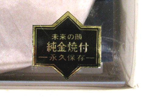 さて、この信楽焼の太陽の顔であるが、過去・現在・未来の3つの顔のうち、最も高価だったのが、純金焼き付けされた未来の顔であった。ケースにも「純金焼付 永久保存」のシールがわざわざ貼付されている。バラ売りもされており、比較的お求めやすい過去と現代の顔が良く売れたような記憶もある。