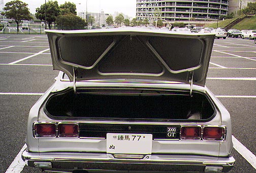 ・撮影日 :1998年04月13日(月曜日) ・撮影場所 :京王多摩センター駐車場 ・使用カメラ:Konica Z-UP80 ・コメント : 日産スカイライン GC10 トランク 必要十分な大きさを持つトランクルーム。下部には、スペアタイヤが 収まる。また、左側横にはジャッキが格納されている。