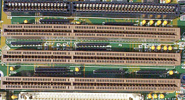 ■ローカルバススロット部分のアップ。3本あるローカルバススロットは、通 常の ISA バスとしても使用可能である。ローカルバスソケットには EISA のものを流用している。当時のローカルバスソケットは、ほとんどが EISA ソケットを流用していた。