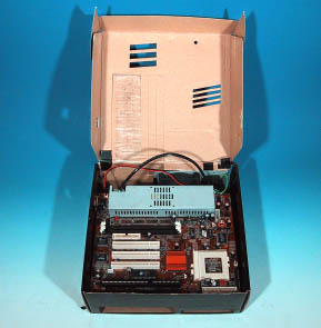 ■コメント このマザーボードは筆者のコレクションの中でも、とりわけ貴重なものです。 PC CHIPS社が試作した電源をオンボード搭載したマザーボードで、あ とにも先にも日本ではこれ1枚しか存在していないハズです。中国本土でも、 いったい何枚残っているのか不明ですが、おそらく数枚のレベルでしょう。 このボードは、1998年当時、雑誌でPC CHIPS社の製品を紹介した 際に、懇意にしていた同社の日本支社長さんから頂きました。国内の互換機雑 誌にも掲載され大変な人気となり、いつ発売されるのかという問い合わせが相 次いだボードです。しかし、様々な規制から、残念ながらこの製品は試作で終 わってしまいました。試作品ながら本製品は、モックアップモデルとは異なり 通常のSocket7搭載のパソコンと全く変わらない動作をしていました。 それだけに、日の目を見なかったのは残念です。 もともと、この製品の開発コンセプトは、オールインワンマザーボードの発想 から来ています。当時、Socket7用チップセットとして、各社が互換製 品を相次いで発表し、低価格マザーボードが続々と発売されていました。そん な中で、PC CHIPS社はコスト優先のパソコン用として、全ての機能が 1枚の基板に収まった製品の開発を行ってきました。オンボードでサウンドや ビデオ、メモリ等を実装して行き、その究極の姿として電源までをも搭載して しまったのです。しかし、それだけでは終わりませんでした。ここまで集積し たのだから、ついでにケースも付けてしまえというエンジニアの「お遊び」で ボードを梱包するダンボール箱そのものがパソコンのケースとしても使えるよ うに設計されたのです。現場の技術者は、このパソコンを「Instant Tower」の名称で呼んでいましたが、日本では「カップラーメンパソコン 」というあだ名で呼ばれていました。その名の通り、お湯(CPUとメモリと HDDとFD)を注ぐだけで、パソコンが出来てしまいます。 いかに「お遊び」とはいえ、それを実際に作ってしまうところが、中国の恐ろ しいところ。この行動力に、現在の中国の経済発展の原点を見るような思いが します。日本ではどうひっくり返っても、このような突拍子もない製品は出て こなかったでしょう。 試作品ということもあり、仕様的には不明な部分も多いボードです。また、各 地の展示会や雑誌社への貸し出しで、本製品そのものもかなりくたびれており コネクタが破壊している部分もあります。今となっては正常に動作するかどう かもわかりません。本ボードは残念ながら製品化されませんでしたが、これを ベースに同社からはATX版のシステムボード、M741LMRが、またその 後、VIAのC3 CPUをオンボード搭載したM787CLRが発売され、 着実に経験が活かされています。