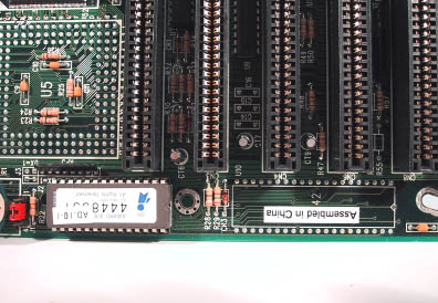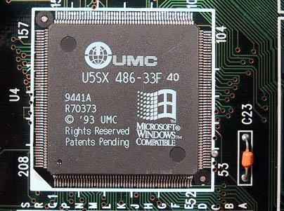 写真3:ボード上に実装された U5SX486-33F/40 CPU ウインドウズコンパチブルのマークが怪しい! |
