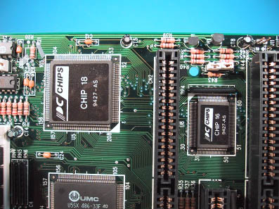 ■CPUにUMC社製U5SX486−33F/40をオンボードで搭載した マザーボード。1994年11月製造。本ボードは残念ながら日本では発売 されなかったという幻の製品。 ■マザーボード上には、208ピンプラスチックQFPのCPUがボード上に 直接ハンダ付けされている。またその隣には、セラミックPGAタイプの CPUも搭載できるように、ランドが設けられている。 ■基板寸法は22×17cmと超小型設計。チップセットはPC CHIPS 社のシールに覆われているため、型番は不明。「PC CHIPS 18」 と書かれたチップは208PinのQFP。PC CHIPS 16と書か れたチップは80PinのQFP。 ■ISAスロット5本、XTスロット1個の古典的な構成。2次キャッシュメ モリは搭載されていない。メモリは30PinのSIMMを4個、72Pi nのSIMMを1個搭載可能。 ■CPUはUMC社が開発したintel486SX互換のもので、inte l社純正よりもパフォーマンスをアップしたもの。CPUクロックは40M Hzであるが50MHzでも安定した動作が可能であった。CPU上には 「Microsoft Windows COMPATIBLE」という文 字と、Windowsのロゴの捺印がある。94年41週製造。開発は93 年となっている。「Patents Pending」の表記あり。 ■CPUクロック設定は33/40/50MHzの3段階が可能。 ■BIOSはAWARD製。キーボードコントローラー用CPUは、チップセ ットに内蔵されているため、ランドのみが残っている。 ■主な使用デバイスは下記の通り。 ・U5SX486−33F/40:UMC社製CPU ・UM9515−01:UMC社製 ・PC CHIPS 18:チップセット(詳細型番不明) ・PC CHIPS 16:チップセット(詳細型番不明) ・AWARD:BIOS ROMチップ ■以下にボードのスペックを示す。
