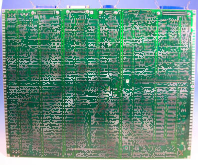 ■NECが1982年11月に発売した初の16ビットパーソナルコンピュータ、 PC−9801(初代機)のマザーボード。現在のマザーボードと異なり、汎用 TTL−ICがびっしりと敷き詰められた異様な基板である。基板の大きさは、 横47×縦37cm。基板上は、シルク印刷で横方向に1〜16まで16区画、 縦方向にA〜Xまで24区画に区切られている。なお、本ボードの製造年月は 1983年の初旬頃と思われる。 ■基板上辺に並んだコネクタは、左側より順に8インチ外付けFDDコネクタ、 DIP−SW2、DIP−SW1、プリンタコネクタ、RS−232Cコネクタ 5インチ外付けFDDコネクタ、B/Wモニタコネクタ、Colorモニタコネ クタとなっている。基板右下にはキーボードコネクタ、左下にはリセットスイッ チが搭載される。 ■CPUはNEC製μPD8086D(5MHz)を搭載。当時16ビットのパー ソナルコンピュータとして発売されていたIBM PCは、バス幅8ビットの 8088を採用していたことを考えると、性能的には優位に立っていた。 ■コプロセッサはオプションで搭載可能。本マザーボードには、intelの 8087が搭載されている。 ■日本製16ビット機であるにもかかわらず、初代9801には漢字ROMが未搭 載であり、オプションとして購入しないと漢字が表示できなかった。後続機種の PC−9801Eからは、第一水準漢字ROMが内蔵されるようになる。本体だ け購入したのでは漢字を表示できなかったという点は、今となっては若干奇異に 感じられる。 ■以下に、NEC PC−9801(初代機)本体のスペックを示す。