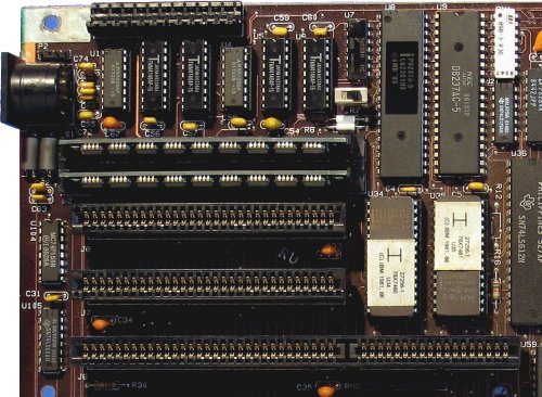 ■PC/XT model286 の SIMM 周辺部分拡大写真。 ■左端上部にあるキーボードコネクタ近辺に SIMM メモリが実装されている。 2バンク構成で、256KB の SIMM を2枚実装する。 ■XT バススロットの右側には、BIOS-ROM が実装されている。本 PC/XT model 286 の BIOS の日付けは、86/04/21。BIOS-ROM 上部には DMAコントローラ である 8237-A が配置されている。