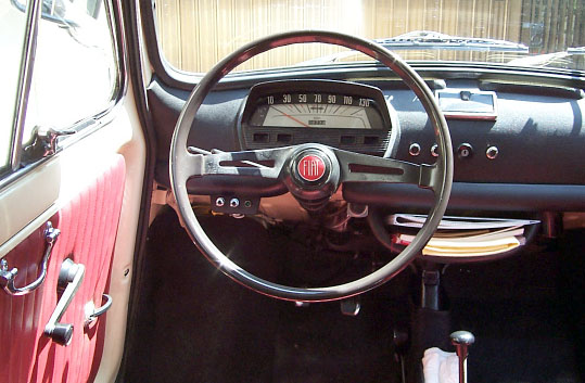 ・撮影日 :1999年03月29日(月曜日) ・撮影場所 :自宅カーポート ・使用カメラ:Kodak DC260 ・コメント : FIAT 500L ダッシュパネル#1 「何も無いようで何でもある。」と言われた FIAT 500L のダッシュ ボード。L タイプの特徴である角型スピードメーターが中央に配置さ れている。純正ステアリングの中央ホーンボタンには、FIAT の文字 が書かれている。角型スピードメーターの横に並んだ4個のスイッチ は、左から「メーターライトスイッチ」「スモールランプスイッチ」 「イグニッションキー挿入口」「ワイパースイッチ」となっている。 これら4個のスイッチの上には灰皿があるが、これが半分さびついて いて、開閉には異常な力が必要となる。ステアリング右下、中央部分 には書類を入れておく小さなポケットがあり、ここに車検証等を入れ ておく。ウインカーレバーとライトスイッチレバーは、両方ともステ アリングの左側に付いており、右側にはレバー等は一切無い。 ウインカーレバーの下に見える2個並んだ小さなスイッチは、左側が ハザード、右側がバックライトである。これらの機能はもともと付い ておらず、そのままでは車検に通らないため、後から付け足したもの だ。画面右下にはシフトノブの上部がちょこっと見える。