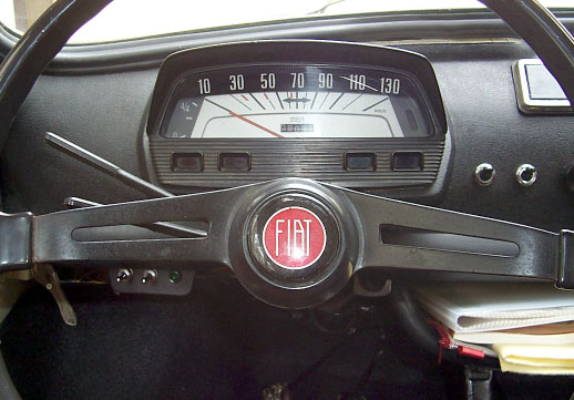 ・撮影日 :1999年04月04日(日曜日) ・撮影場所 :自宅カーポート ・使用カメラ:Kodak DC260 ・コメント : FIAT 500L ダッシュパネル#2 角型スピードメータ周辺のアップ。スピードメーターの左横には燃料 計が配置されているが、これは L タイプから標準装備されたもの。 それまでは燃料の約 3/4 を使うと点灯するランプがついていただけ で、残量メーターは付いていなかった。スピードメーターの「70」の 文字の下にある左右矢印は、ウインカ ーに連動して点滅するランプ で、通常は消灯しており、ウインカーを出すと点滅する。左右の矢印 の形となっているが、右を出しても左を出しても全体が点滅するとい う面白い仕様である。(単なる手抜き?)ちなみに、筆者の車では、 リレーの不調でこのランプが常時点灯しており、ウインカーを出すと 点滅するようになっていた。これは近々に修理する予定。 メーターの中央には5桁の積算距離計が付いている。トリップメータ ーは無い。スピードメーターの右横には油圧警告ランプが配置されて いる。メーター下部に4つ並んだランプは、左から「ジェネレーター 警告灯」「燃料警告灯」「アッパービーム」「ヘッドライト」となっ ている。