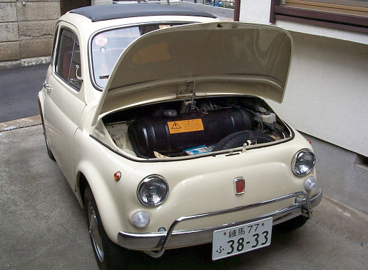 ・撮影日 :1999年04月04日(日曜日) ・撮影場所 :自宅カーポート ・使用カメラ:Kodak DC260 ・コメント : FIAT 500L ボンネット 運転席左下のレバーを引くとノッチが外れてボンネットを開けること ができる。このフロントボンネットは、ノッチが古くなると走行中に 空いてしまうことがあるそうで、走り屋の中には専用のベルトで開か ないように固定したり、中にはガムテープを張る人もいるとか。ボン ネットは、ある一定以上の角度で開けるとステーが引っかかって開い たまま固定される。余談であるが、助手席側のドアミラーがステーの みになっているのは、取り付けの際にミラーが破損してしまったため である。ミラーは台湾製らしいが、取り扱いが荒いとすぐに壊れてし まう。困ったものだ。