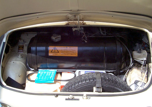 ・撮影日 :1999年04月04日(日曜日) ・撮影場所 :自宅カーポート ・使用カメラ:Kodak DC260 ・コメント : FIAT 500L ボンネット内部 リアエンジン、リアドライブの車だから、フロントボンネットにはさ ぞかし大きなラゲッジスペースが確保されていると思いきや、20リ ットルの燃料タンクとスペアタイヤ、各種工具、バッテリーでご覧の 通りかなり窮屈である。燃料タンクは現在の車からすれば容量は少な いが、ボディの大きさそのものが小さいため巨大に見える。バッテリ ーは、スペアタイヤの左下の部分に格納されているため、この角度か らは見ることができない。ウインドウウオッシャー液は、スペアタイ ヤ右側にマウントされているビニールの袋に入っている。この写真で は、上部がスペアの右側にちょこっとだけ見えている。燃料タンク右 の白いタンクは、ブレーキ液のリザーブタンクである。ボンネットの 中には、非常用のタイミングベルトの予備が入っている。シャシー番 号「5032653」の刻印は、フロントラゲッジ左上部にある。