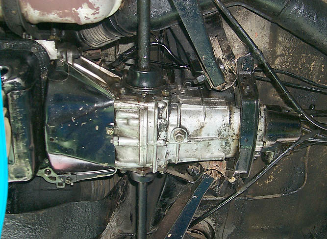 ・撮影日 :1999年07月21日(水曜日) ・撮影場所 :タイヤ館西荻窪店 ・使用カメラ:Kodak DC260 ・コメント : FIAT 500L ミッション&デフ ちょうど車体の中央付近を下から見たところ。後輪を駆動するドライ ブシャフトが上下に通っており、中央にミッションとデファレンシャ ルユニットが見える。ミッションボックス下にあるナットは、ミッシ ョンオイルのドレン用。左側の黒いカバーが、エンジンのオイルパン の一部である。写真上の「へ」の字型ダクトは、エンジンの余熱を利 用した室内暖房用のダクト。この写真では、向かって右側がフロント で左側がリアとなっている。