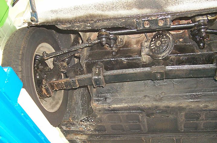 ・撮影日 :1999年07月21日(水曜日) ・撮影場所 :タイヤ館西荻窪店 ・使用カメラ:Kodak DC260 ・コメント : FIAT 500L 右前輪部分のアップ 右前輪部分を下から見上げたところ。ちょうど助手席の裏側になる。 ウィッシュボーンの前輪サスペンションとダンパーが良く見える。