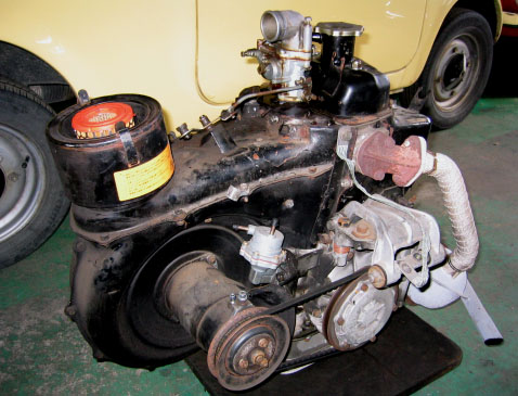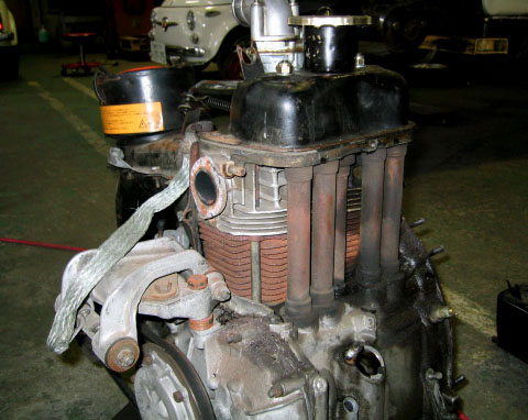 写真3.FIAT500 エンジン本体 #3 エンジンを真上から見た図。エア・フィルターはまだ新品同様なので、そのまま使用することにする。エキゾースト・フランジは錆で真っ赤!!! |