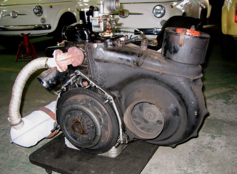 写真2.FIAT500 エンジン本体 #2 この方向からはなかなか見ることができないエンジン外観。クラッチとフライホイール、そして空冷用フィンが見える。結構油で汚れているものの、それほどではないかな?といった感じ。 |