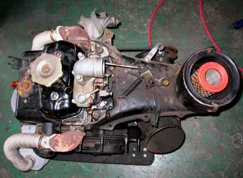 写真4.エンジン本体をマフラー側から見たところ マフラーは錆て穴が開いていたものをリビルトし再塗装したので、一見新品に見える。クランクケースの油汚れが目立つ。 |