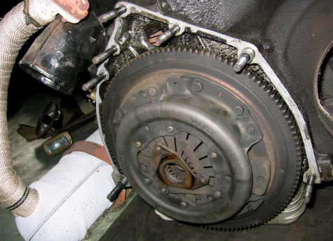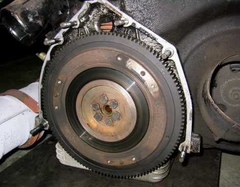 写真8.クラッチを取り外してフライホイールが露出したカット フライホイールは、6本のボルトとロック・ワッシャーにより頑丈に固定されている。これを分解するためには、ロック・ワッシャーをマイナスドライバとハンマーで破壊して行う。 |