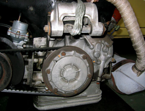 写真6.オイルフィルターカバーとファンベルト部分 アルミ製であるが、長年の使用による埃と油で、結構汚れまくっている。 |