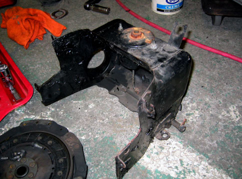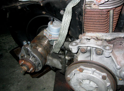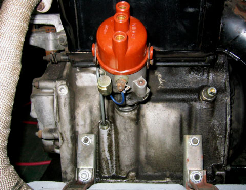 写真7.クランクケースのディストリビュータ側 油と埃でどろどろに汚れたクランクケースの側面。ディストリビュータとエンジンオイルのディップ・スティック、マフラーのステーが見える。 |