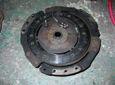 写真9.取り外したクラッチ板 良く見ると、写真手前側の円周部分が偏摩耗している。ダイヤフラム・スプリングの圧力の差によるものと思われる。実際使用していて、若干のジャダーを感じたことがあったが、これが原因だったと思われる。 |