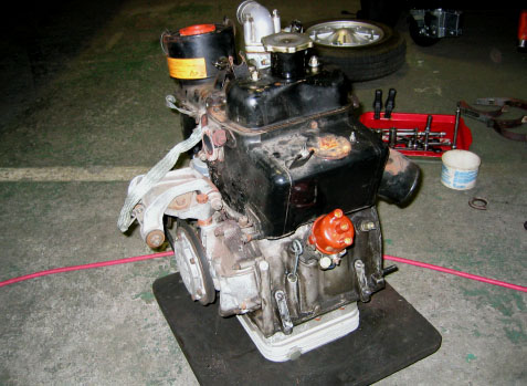 写真1.FIAT500 エンジン本体 #1 降ろしたてのエンジン本体!こんなにちっちゃい!成人男性であれば、一人で持ち上げることができるほどの大きさ、重さである。(最も、箸より重いモノを持ったことがない筆者には到底無理だが・・・ ヽ(´ー`)ノ) |