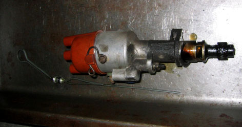 写真12.取り外したディストリビュータとディップスティック 筆者のクルマの泣き所であったディストリビュータ。ご覧の通り、油と埃でドロドロの状態。しかし、この部品には苦労させられたなぁ。。。 |