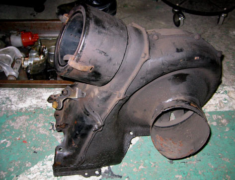 写真14b.分離したエア・カウリング #2 空冷ファンとダイナモが搭載されている左側エアカウリング。こんな感じで一体型でガバっと外すことができる。内部には空冷ファンが入ったまま。このパーツはこれから完全に分解した後、ブラスト処理して塗装する。ファンは後ほど、ちょっとしたテクニックで強化を図る。 |