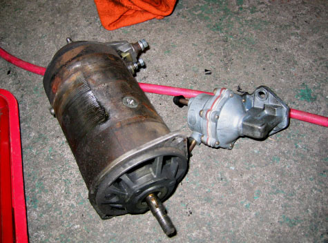 写真17.取り外したダイナモと燃料ポンプ このダイナモも今回のO.H.でリビルトする。燃料ポンプは既に電磁式に変更しているので現在は使用していない。 |