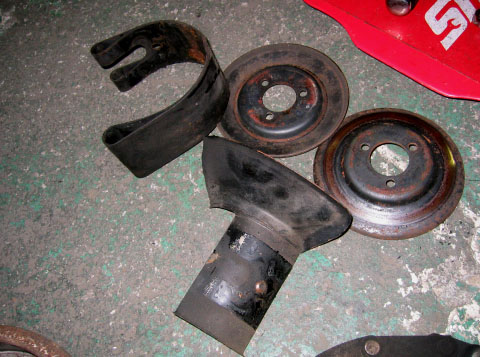 写真18.ダイナモプーリーとステー ダイナモに付いていたプーリーとダイナモステー、それとファンベルトカバーの一部。 |