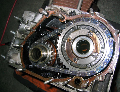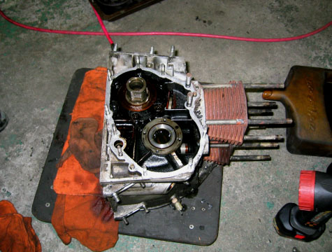 写真4.タイミングチェーンを取り外したクランクケース クランクシャフトはスプロケットがはずされた状態になっている。これより、ピストンを取り外した後、クランクシャフトとカムシャフトを抜き去る作業を実施する。 |