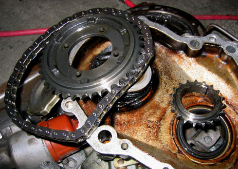 写真1.タイミングチェーン タイミングチェーンカバーを外したところ。ロックワッシャーで固定された、4個のカムスプロケットのボルトが見える。チェーンそのものは6年前に整備を受けているはずで、痛みや汚れはほとんど無い。 |