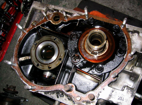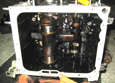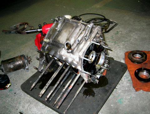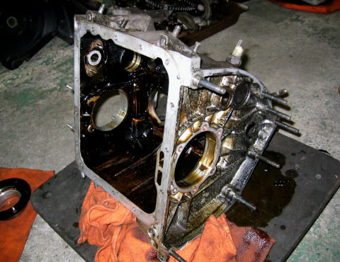 写真8.クランクケース内部 クランクシャフトとカムシャフトがまだ付いた状態。これからこの2大シャフトの抜き取り作業が始まる。結構コツがいる作業のようだ。 |