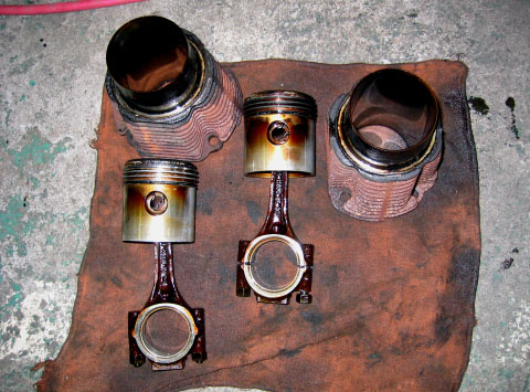 写真7.ピストンとコンロッド 取り外したピストンとコンロッド。結構焼けてます。ピストンリングは割れも無く無事とのこと。開けてびっくり、といったようなことは、今回起こらなかった。。。これはこれで良かったのだが、ドラマチックな展開ぢゃねえなぁ・・・・(;´Д`) |