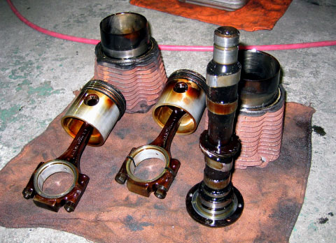 写真10.クランクシャフト取り外し 最後に、クランクシャフトを分離する。既にとりはずされているピストン、シリンダーと共に仲良く記念撮影の図。 |