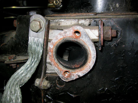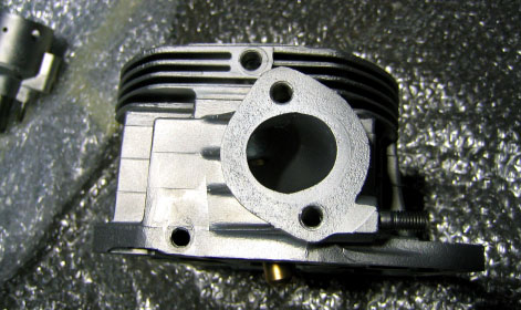 写真3a.加工前のエギゾーストポートのアップ 加工前のエギゾーストポートはこんな感じでした。穴の中がカーボンで真っ黒・・・ |