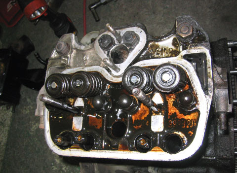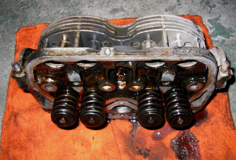 写真1a.加工前のシリンダーヘッド ウェットブラスト加工を施す前のシリンダーヘッド。いやあ、汚ないでつねぇ〜〜〜。 |