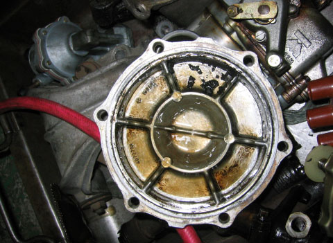 写真12.ディストリビューター本体内部 まぶしいばかりに光り輝くディストリビュータ内部。この部品は良く不調となり、いつも泣かされてきたものだが、ここまでオーバーホールすればもう大丈夫であろう。 ヽ(´ー`)ノ |