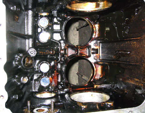 写真17b.加工前のクランクケース内部 で、これが処理加工前の状態。フォトショップで明るさ調整してあるから、何とか状況を把握できるが、ちょっと目には真っ黒に汚れて何がなんだかわかなない状態であった。 |