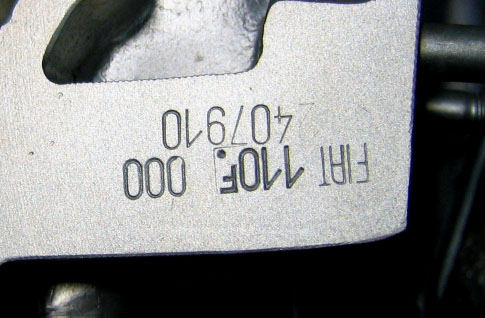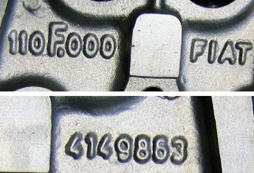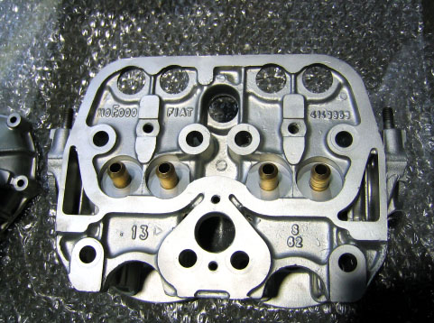 写真4.シリンダヘッド内部の刻印 オイル焼けとカーボンで以前は確認できなかった、シリンダーヘッド内部のシリアル番号、型番の刻印も鮮明に読みとれる。今回ウェットブラスト加工を施して判ったのだが、フィアットのアルミ部品は、ほとんど全てにFIATの文字とシリアル番号が刻印されていた。けっこうマネなのね、FIATって。。。 ヽ(´ー`)ノ |