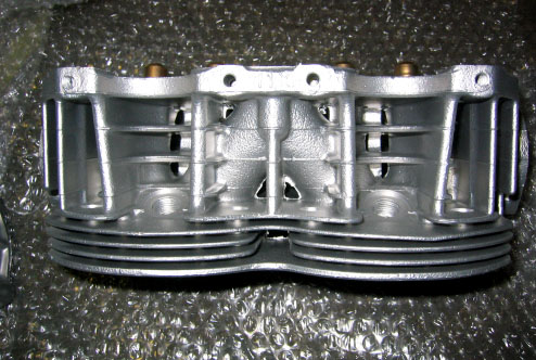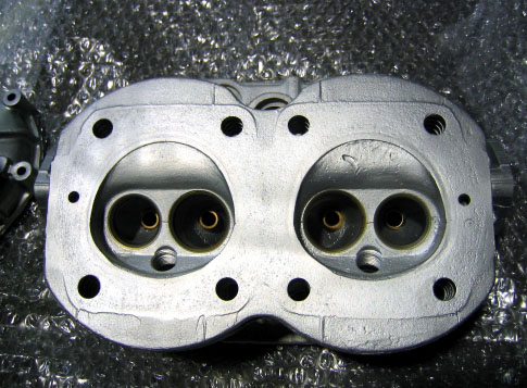 写真1b.ウェットブラスト加工後のシリンダーヘッド 工場内の水銀灯の下でギラギラと輝くまでに磨き上げられたシリンダーヘッド。分解する現場を実際に見ているので、Before、Afterの差は歴然である。汚れてハッキリと見えなかったシリアル番号も、くっきりと読みとれる。 |