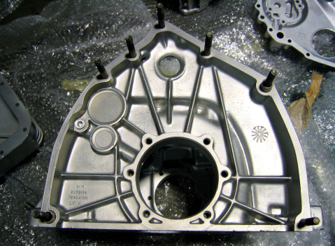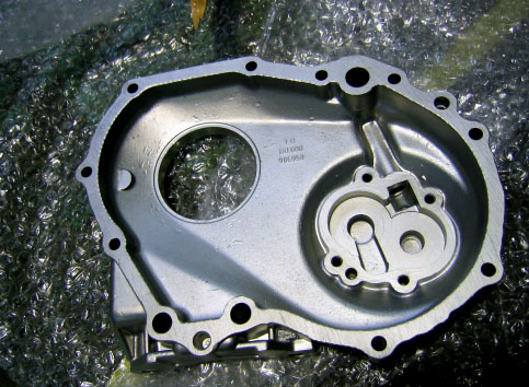 写真6a.加工前のタイミングチェーンカバー裏面 ウェット・ブラスト加工を施す前のタイミングチェーンカバー裏面はこんな感じだった。ヌタヌタのド〜ロドロ状態・・・・お好み焼きを焼きまくった後の鉄板のよう! |