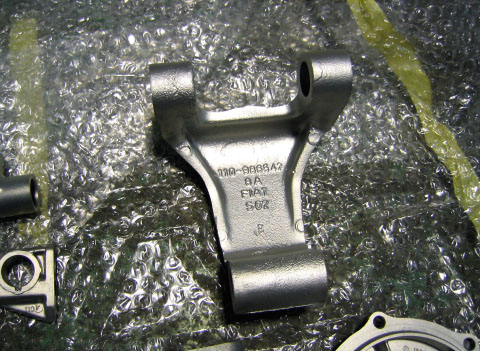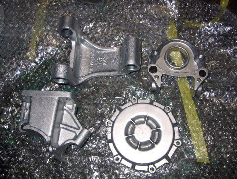 写真7.ウェットブラスト加工後のパーツ類 上段左側よりリアサポートアーム、リアサポート、下段左よりダイナモブランケット、クランクプーリーカバーの各パーツ。アルミ素材の輝きがそのまま出ている。 |