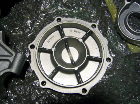 写真6b.加工後のタイミングチェーンカバー裏面 あれだけオイル焼けしていたパーツも、とってもキレイになった。内部に刻印されたシリアルも鮮明に読める。刻印番号だが「3H 110.000 986958」となっていた。 |
