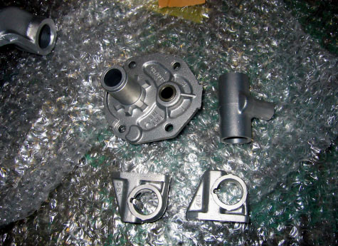写真9.ウェットブラスト処理が終了した細かいパーツ類 オイルポンプ、ロッカーアームシャフトホルダー、オイルパイプシャフトホルダーの各部品。オイルポンプには「987092 FIAT110F」の刻印が、またその他の細かいパーツにも「FIAT」と「110F」の刻印が施されていた。 |