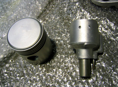写真11b.処理後のピストンとディストリビューター ウェットブラスト処理した後の、ピストンとディストリビューター本体。今回660ccにボアアップするので、オリジナルのピストンは使用しないのだが、製造時から今まで、苦楽を共にしてきた車のピストンということもあり、記念に持って帰るため特別に加工してもらった。オブジェとして飾って置いても違和感無いくらい、磨き上げられている。 |