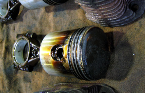 写真11a.加工前のピストン エンジン全バラ時に取り出したばかりのピストン。ヘッドにはカーボンがびっちりと付着し、側面はオイル焼けがひどかった。ヘッド上面のカーボンは、ちょっとやそっとじゃ落ちません。 |