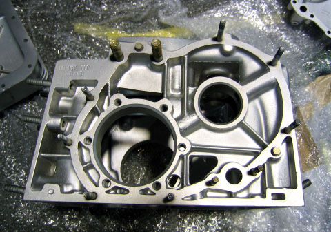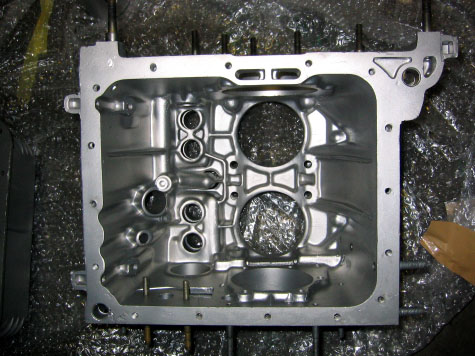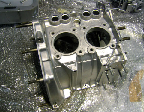 写真13.クランクケース本体上部 上部に開いた2個の穴はピストンシリンダーが装着されるところ。今回ボアアップを実施するため、ボウリング処理にて穴の直径を拡張することになる。向こう側には、4個+1個のプッシュロッドチューブ用穴が見える。 |